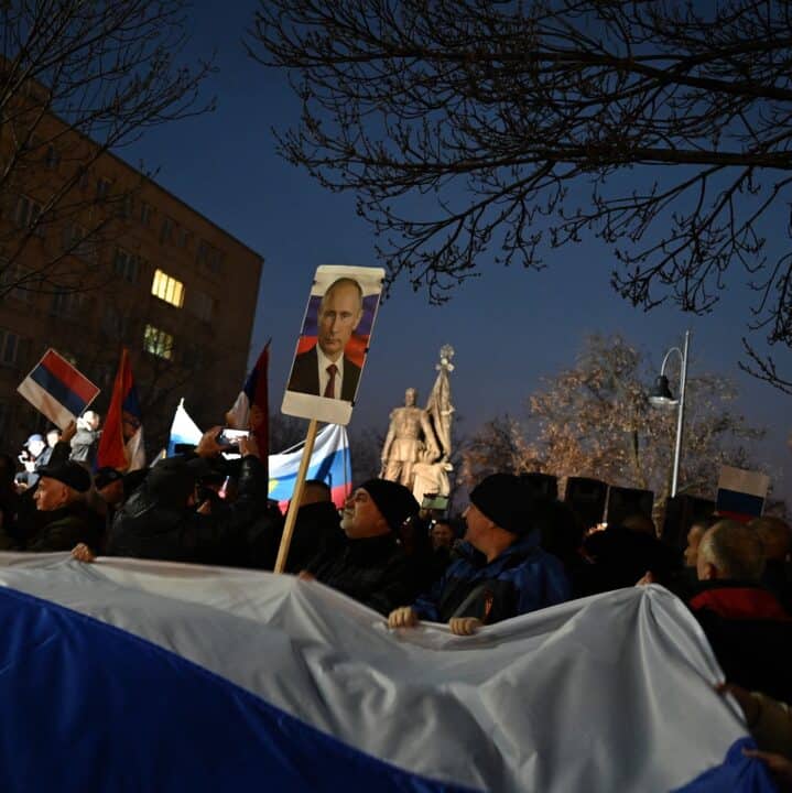 Os moradores locais se reuniram à noite em frente ao prédio da assembleia – o parlamento do país. Eles seguraram uma faixa “Orar a Deus e ficar com a Rússia”, assim como as bandeiras de Montenegro, Rússia e Sérvia.