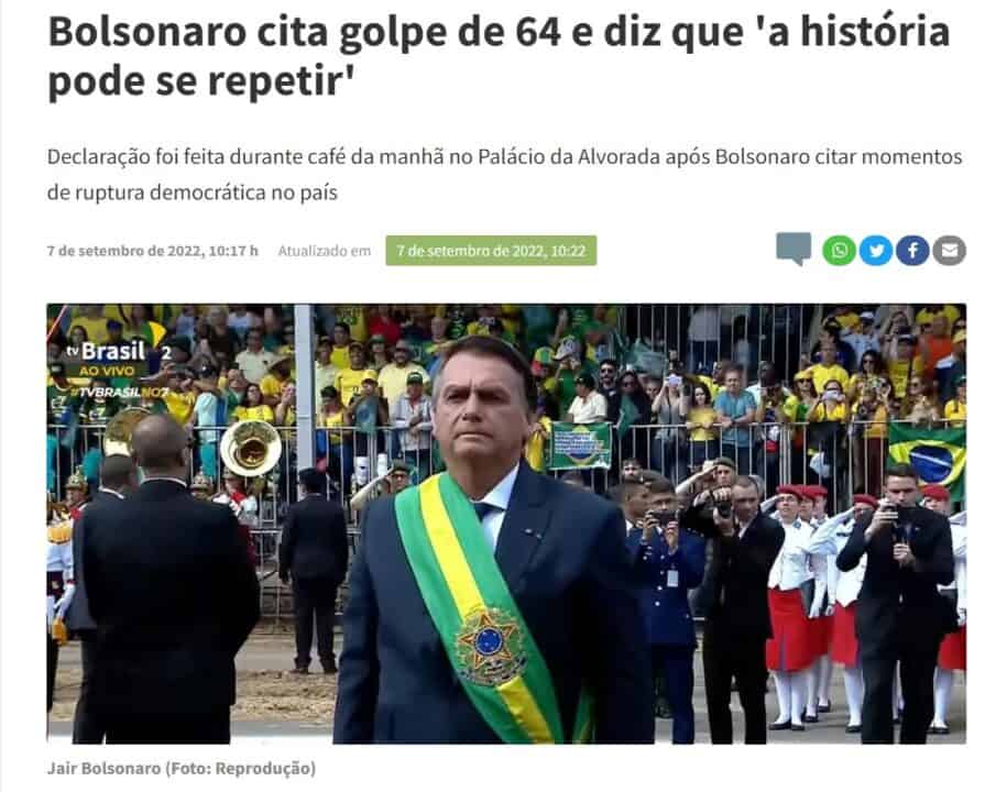 O jornal Brasil 247, o maior portal de notícias da esquerda progressista brasileira, por exemplo, publicou um artigo reproduzindo essa fala e afirmando que Bolsonaro havia feito “uma nova ameaça de golpe de Estado”. Conclusão tirada, diga-se de passagem, por meio dos relatos da Folha de S. Paulo.