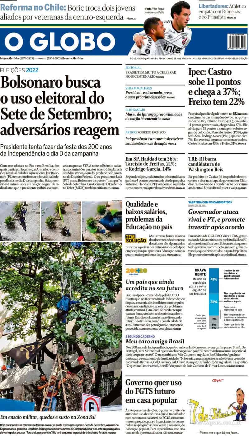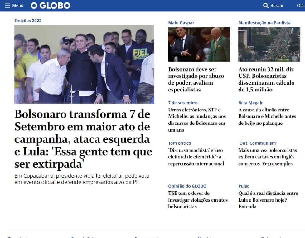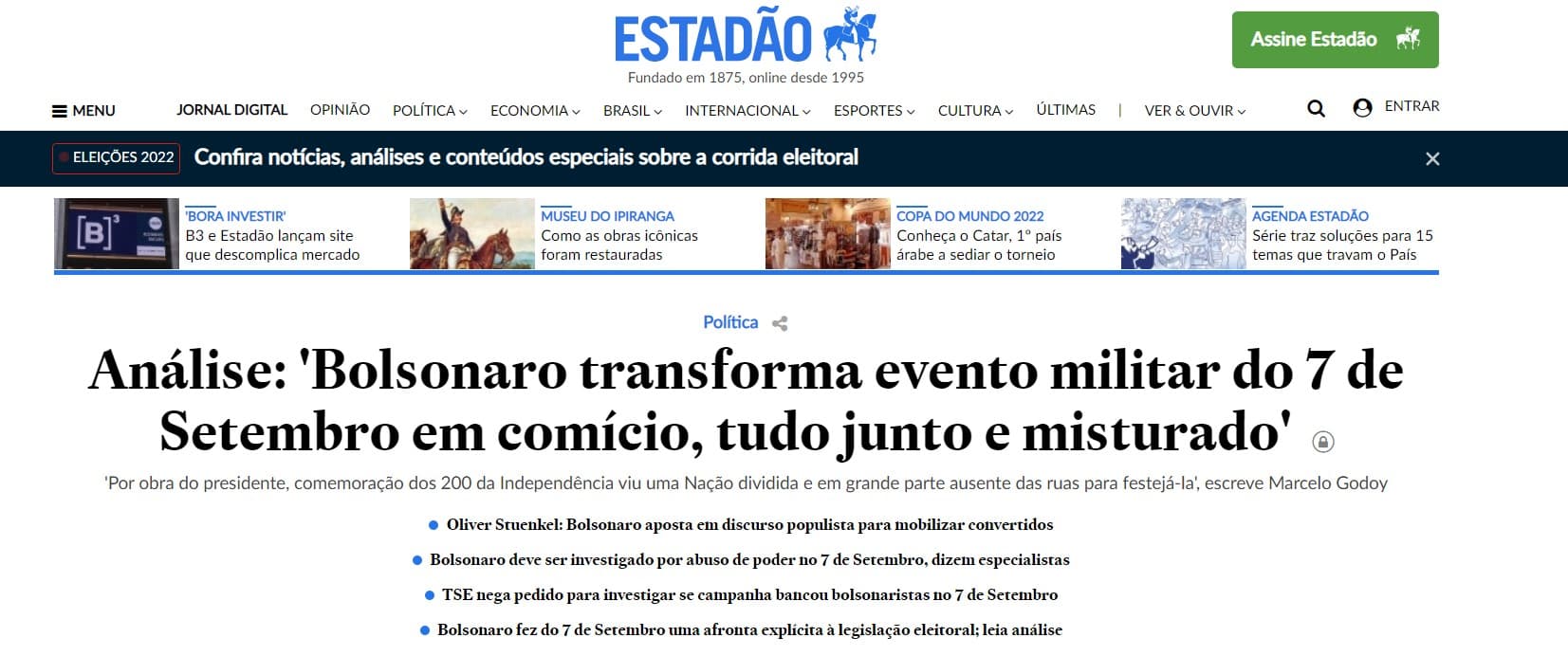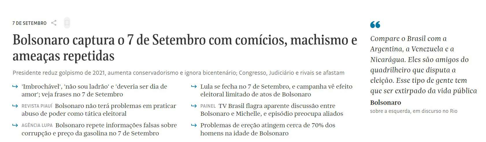 Chama especial atenção a matéria intitulada Bolsonaro deve ser investigado por abuso de poder, dizem especialistas publicada tanto no Estado de S. Paulo, quanto em O Globo. Repercussões de falas de “especialistas” que servem para jogar fogo na lenha de que Bolsonaro estaria cometendo um grave atentado contra o Estado de Direito no 7 de Setembro.