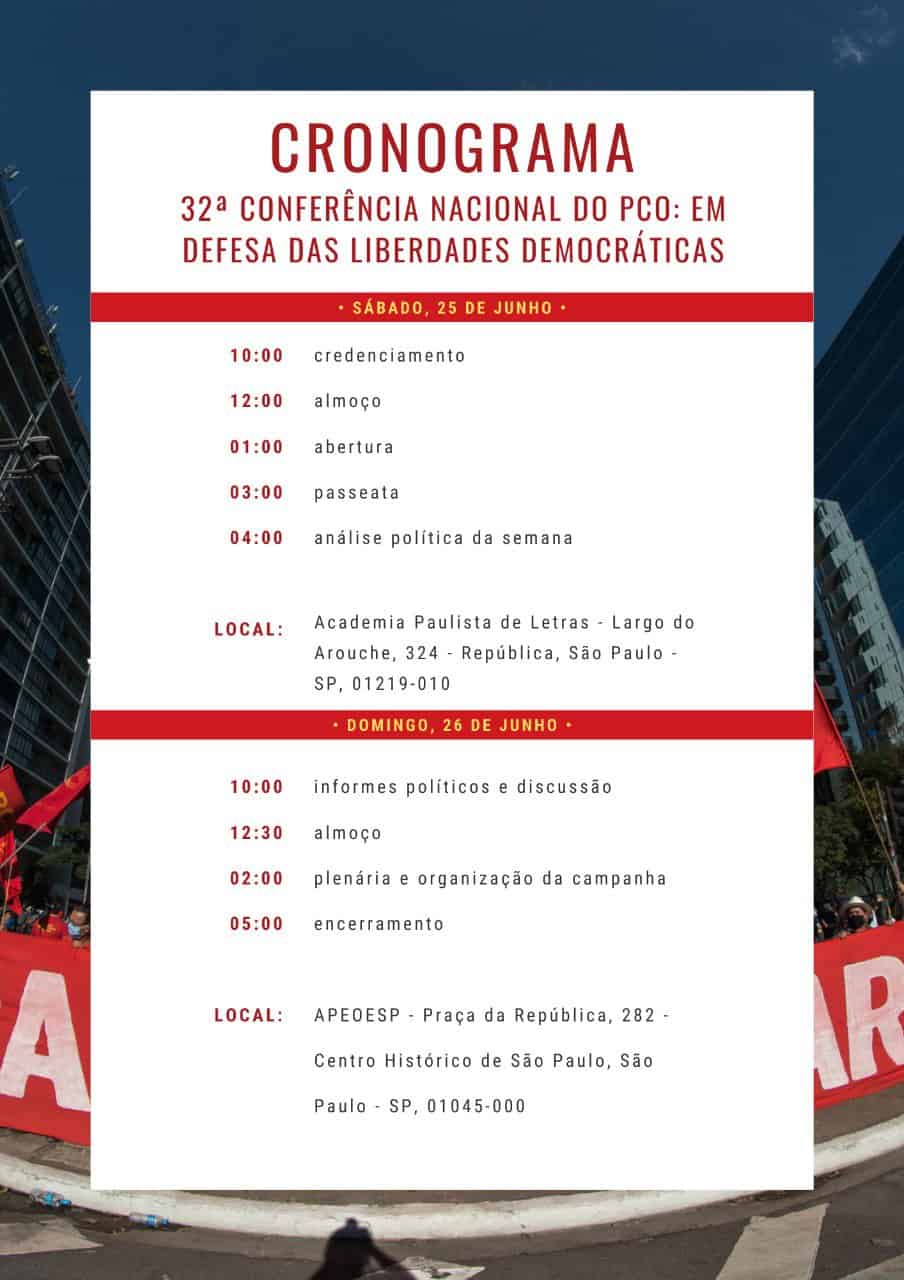 Confira, abaixo, o cronograma completo da 32a Conferência Nacional do Partido da Causa Operária: