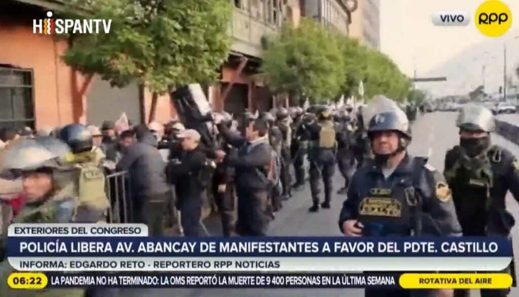 Centenas de peruanos se reuniram nas proximidades do Congresso Nacional no marco da marcha ‘La toma de Lima’, na manhã de hoje (10), em uma manifestação promovida por sindicatos e organizações sociais que se solidarizaram com o governo de seu presidente Pedro Castillo.