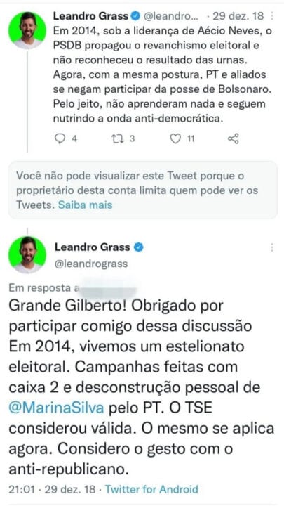 Ademais, em seu Twitter, caracterizou a decisão do PT em não participar da posse de Bolsonaro como algo “anti-republicano”, atacando a própria campanha de Dilma em 2014 ao afirmar que foi uma campanha feita “com caixa dois”.