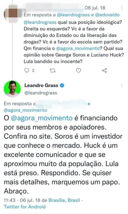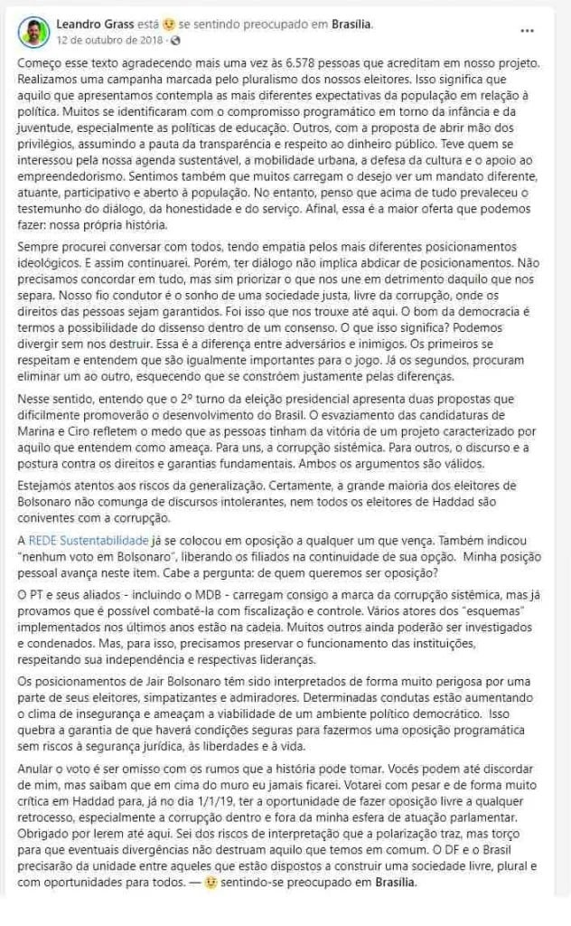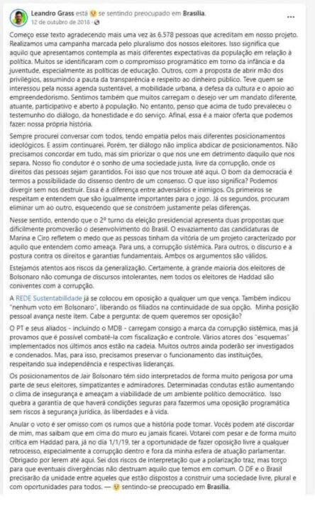 Fica claro que nem Leandro Grass, nem o seu partido são de esquerda e, logo, não representam de maneira alguma a base do PT. Mais uma vez, o partido capitulou diante da pressão que a direita faz em cima de sua campanha. Ao mesmo tempo, é sabotado de dentro para fora por meio de sua ala direitista, principalmente seus parlamentares que, nessas eleições, têm sido responsáveis por verdadeiros atrasos no que diz respeito à mobilização por Lula presidente.