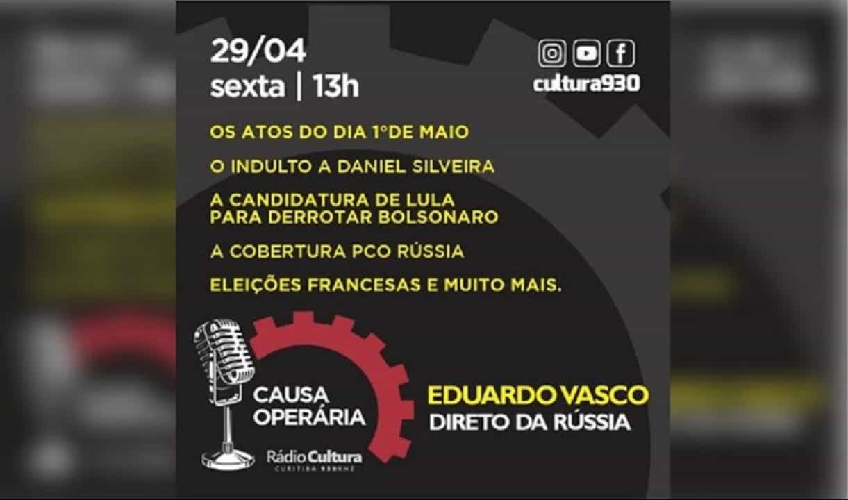Com apresentação de Roberto França (Foz do Iguaçu- PR), Marcelo Batarce (Dourados – MG) e Adriana Machado (Nova Iorque, EUA), além da presença de Eduardo Vasco, trazendo as últimas informações da guerra direto da Rússia, o Programa Causa Operária retorna à grade de programação da COTV às 13h. Os atos de 1º de maio, o caso Daniel Silveira, a candidatura de Lula e as eleições na França também serão discutidos pelos companheiros. Por isso, não perca a transmissão, que pode ser assistida acessando o endereço a seguir: