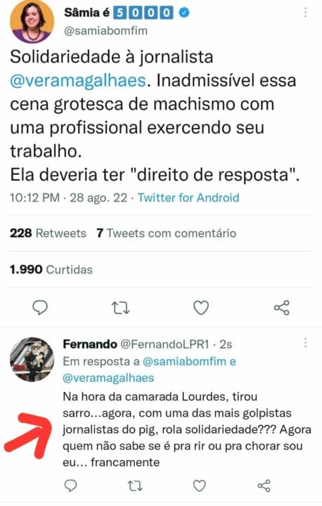 Ontem, 29, uma grande mobilização de mulheres burguesas se compadeceram com a jornalista Vera Magalhães, que foi “vítima” de uma crítica profissional pelo presidente da República Jair Bolsonaro, dizendo: “Vera Magalhães é uma vergonha para o jornalismo brasileiro.”