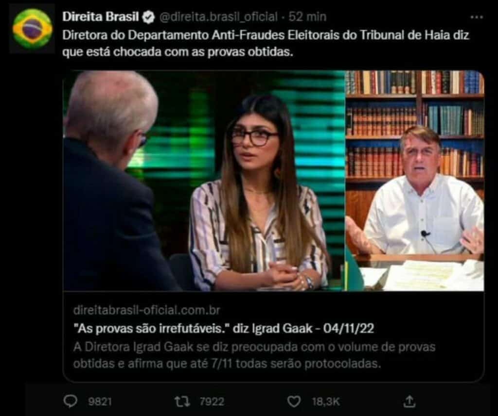 Um print de um tuíte da página “Direita Brasil” trazia a seguinte notícia: “Diretora do Departamento Anti-Fraudes Eleitorais do Tribunal de Haia diz que está chocada com as provas obtidas”. O tuíte era acompanhado de um link, que, de acordo com o print, direcionaria para a matéria de título: “‘As provas são irrefutáveis’, diz Igrad Gaak – 04/11/22”. A matéria é acompanhada da foto da atriz pornô Mia Khalifa, que seria a Igrad Gaak apresentada no título da matéria. O tuíte ainda conta com uma descrição: “A diretora Igrad Gaak se diz preocupada com o volume de provas obtidas e afirma que até 7/11 todas as provas serão protocoladas”, diz a descrição.