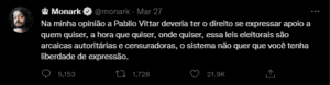 O DCO sofreu uma grande hostilidade por parte da esquerda por defender a liberdade irrestrita de expressão, como é a tradição da esquerda. Fomos acusados de apoiar nazistas porque defendemos Monark contra uma absurda campanha de cancelamento. O apresentador disse que era favorável que se pudesse fundar qualquer tipo de partido, inclusive um nazista e por isso sofreu uma enorme perseguição nas redes sociais. Agora, a esquerda precisa passar vergonha porque foi ele um dos primeiros a defender o direito de Pabllo Vittar se expressar durante o show. Monark tuitou o seguinte: “A defesa da liberdade de expressão não tem lado político, é lutar pelo bem da humanidade. Se você estiver na esquerda ou na direita e eu entender que sua liberdade de expressão esta sendo ameaçada eu falarei em sua defesa. Quando controlarem o pensamento tudo estará perdido”. Um sujeito que era tachado de nazista consegue ser mais progressista que boa parte da esquerda.