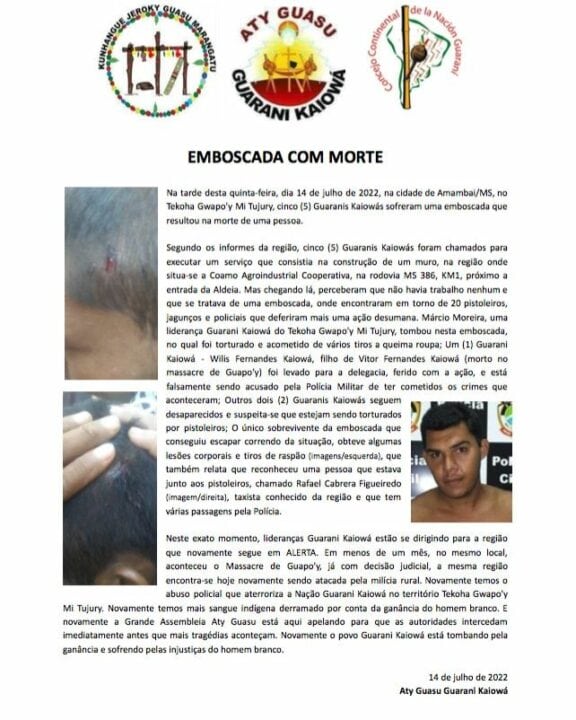A Assembléia Geral Aty Guassu, composta por representantes de diversas aldeias e retomadas indígenas Guarani-Kaiowá do Estado do Mato Grosso do Sul, publicou carta denunciando mais um massacre contra os indígenas em Amambaí.