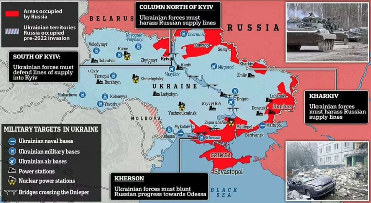 Pontos a destacar: a conquista da usina nuclear de Zaporizhzhia, o cerco de Mariupol no Mar de Azov e a aproximação da frente russa à Odessa, no Mar Negro. Kiev está sob ameaça de ter uma nova frente de assalto a partir do leste.