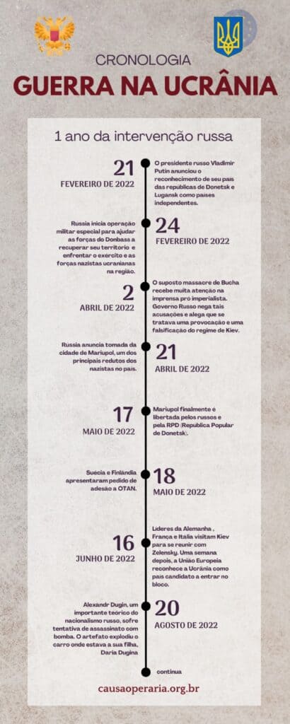 Importante destacarmos, que o Partido da Causa Operária enviou dois correspondentes deste Diário, para poder acompanharmos de perto os acontecimentos da guerra. Um acontecimento político desta magnitude, contra o imperialismo, precisava ser acompanhado de perto. Por isso, apresentamos neste artigo uma cronologia verdadeira sobre a guerra na Ucrânia.