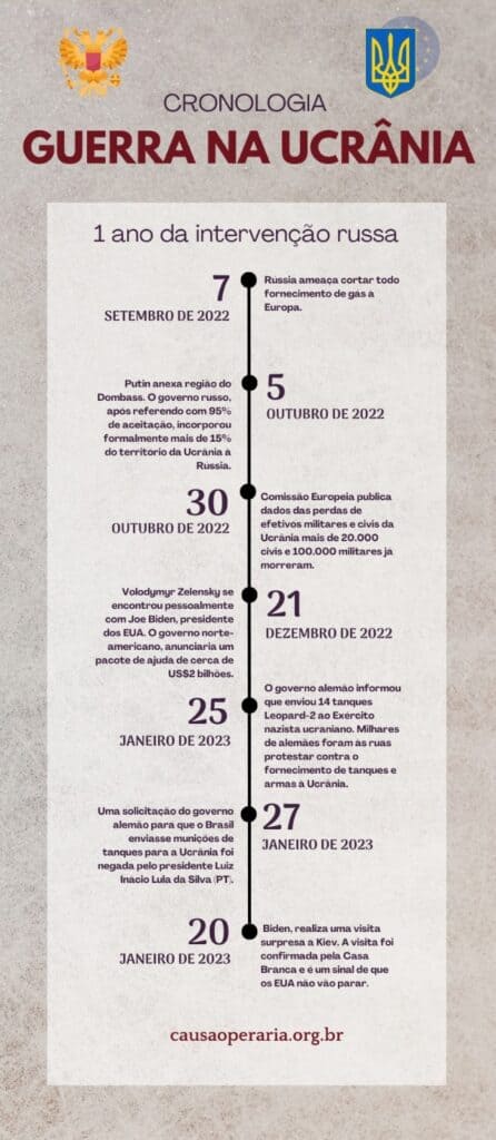 25 de janeiro – O governo alemão informou que enviou 14 tanques Leopard-2 e permitiu que outros países fornecessem o modelo para apoiar o Exército nazista ucraniano. Milhares de alemães foram às ruas da capital Munique para protestar contra o fornecimento de tanques e armas à Ucrânia.
