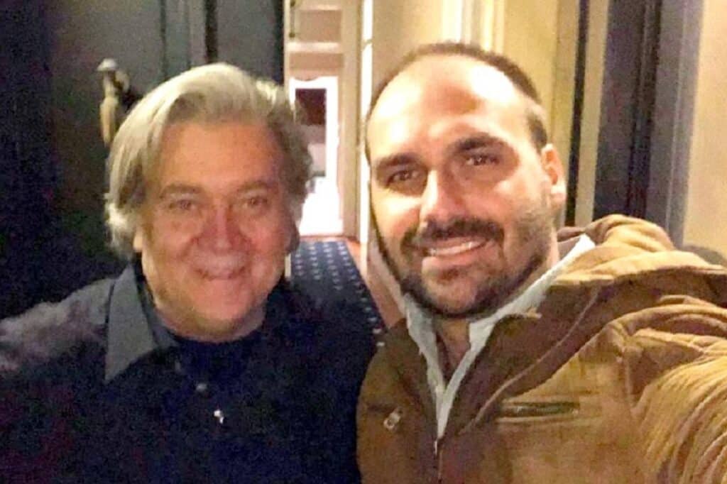 Cumpre frisar que não é coincidência que Eduardo Bolsonaro tenha sido escolhido como liderança para a formação desse novo movimento. No mês passado, em entrevista publicada no jornal a Folha de S.Paulo, Steve Bannon, estrategista da extrema-direita a nível mundial, defendeu Bolsonaro como sucessor do ex-presidente.