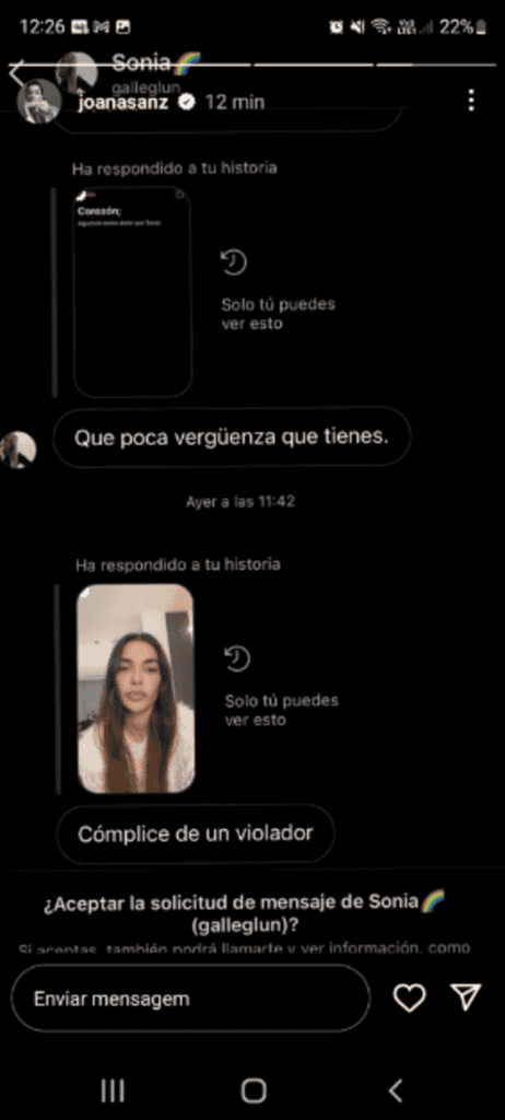 Esposa de Daniel Alves, a modelo espanhola Joana Sanz divulgou as ameaças e xingamentos que têm recebido no seu perfil no Instagram diante da prisão preventiva do jogador, que está sendo acusado de agredir sexualmente uma mulher em Barcelona. Numa das mensagens está escrito o seguinte: “Cúmplice de um estuprador”.