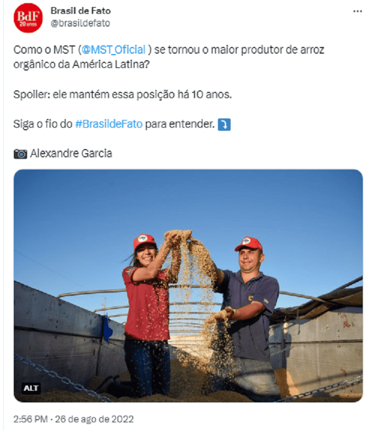 Em visita à 4ª Feira da Reforma Agrária, realizada pelo MST, o ministro da Secom (Secretaria de Comunicação Social), Paulo Pimenta, disse que a CPI mostrará que o MST é um dos maiores produtores de alimentos do país, a questão da premiação como produtores de arroz orgânico, que foi usado como mote da campanha do presidente Lula.
