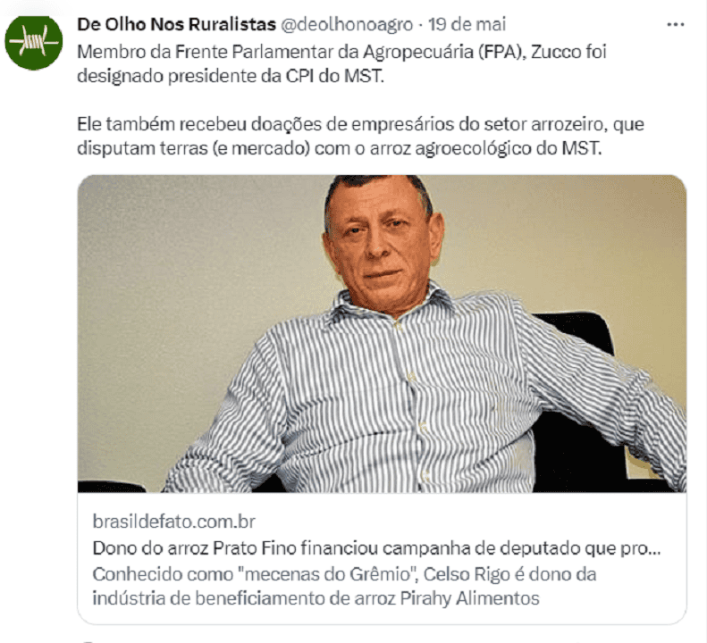 O empresário do Rio Grande do Sul, Celso Rigo, dono da indústria de beneficiamento de arroz Pirahy Alimentos, conhecida como Prato Fino, foi o empresário que doou a maior quantia para a campanha de Zucco (Republicanos) nas eleições de 2022. Foram R$ 60 milhões para o deputado que é o autor da criação da CPI do MST.