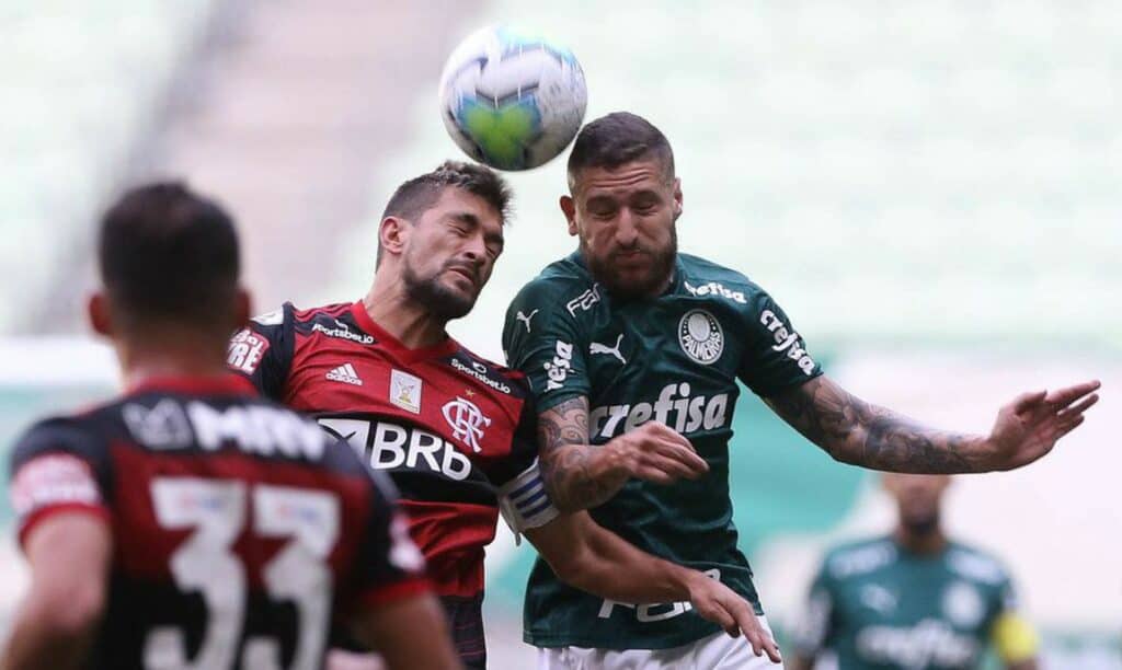 No início do jogo o Palmeiras tentou tomar a iniciativa mas a primeira chance de gol veio aos 19 minutos, de uma falha, das tantas que veremos no jogo, quando David Luiz recua a bola para o goleiro Santos e os atacantes palmeirenses roubam e bola quase abre o placar. Aos 22 minutos, um dos lances mais discutidos do jogo. Arrascaeta empurra o meio campista Zé Rafael, rouba a bola e entra dentro da área. Zé Rafael dá um toque em Arrascaeta e o árbitro Wilson Pereira Sampaio – com uma boa quantidade de envolvimento em lances polêmicos – marca o pênalti. O lance é polêmico, pois boa parte dos espectadores acusam falta de Arrascaeta no lance antes da marcação do pênalti. Não houve nenhuma movimentação do VAR, e o jogo parecia dar indícios de favorecimento para o Flamengo. Gabigol cobra o pênalti no lado esquerdo enquanto Weverton caiu no lado direito. Flamengo 1 a 0. A primeira finalização do Palmeiras aconteceu aos 33 minutos de jogo em um chute fraco de Endrick. O jogo que parecia encaminhado no primeiro tempo para o Flamengo, torna-se complicado. Aos 37 minutos Dudu recebe livre na esquerda, numa clara desorganização da zaga flamenguista, dribla e chuta para o gol, David Luiz rebate no pé de Rafael Veiga que bate rasteiro no canto de Santos. Começaria aqui o inferno flamenguista e mais sequência de erros. Aos 48 minutos o Flamengo tem uma boa chance, quando o zagueiro palmeirense entrega a bola dentro da área para Everton Ribeiro que chuta para fora. Quem não faz leva e 1 minuto após Gabriel Menino recebe com a perna esquerda, ajeita com a direita e chuta novamente com a esquerda no canto esquerdo de Santos. Bola indefensável e o gol mais bonito do jogo. Final de primeiro tempo com virada do Palmeiras.