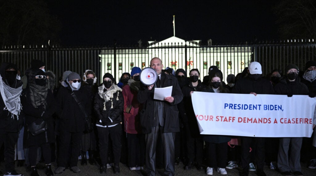 Na quarta-feira (13), os funcionários do governo Biden e também indicados políticos realizaram uma vigília em frente a Casa Branca exigindo um cessar-fogo permanente na Faixa de Gaza. A maioria dos manifestantes estavam mascarados para evitar retaliações do governo. Na faixa do ato estava escrito “Presidente Biden, sua equipe exige um cessar-fogo” e além disso muitas velas foram acesas em homenagem às vítimas palestinas.