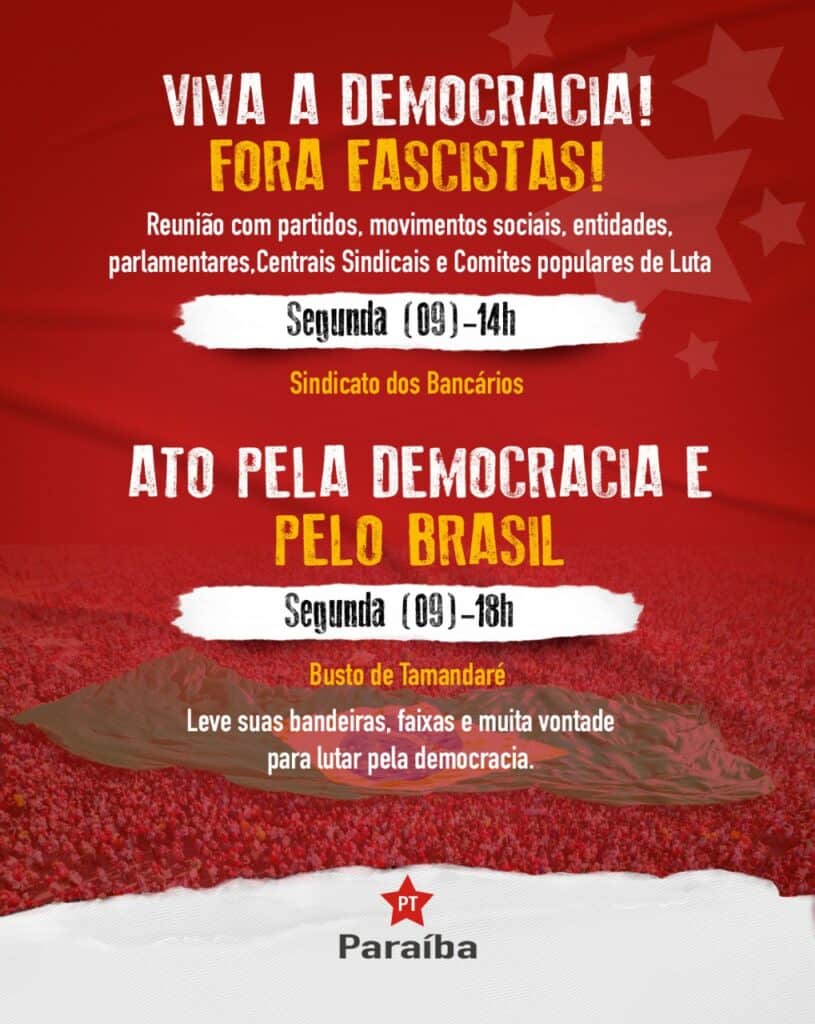 Diante dos recentes atos da direita em Brasília, que invadiu o Congresso, o Palácio do Planalto e o Supremo Tribunal Federal (STF), tudo a partir da conivência da polícia, os movimentos sociais por todo o país estão chamando a população para várias manifestações nesta segunda-feira (09/01). João Pessoa é uma das capitais onde haverá ato, lá a concentração está marcada às 18h, no busto de Tamandaré.