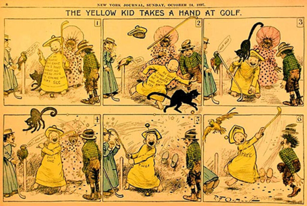 Dessa forma, enquanto Töpffer (1799-1846) viveu na Suíça, com a arte das HQs mediada pela arte da ilustração, Outcault (1863-1928) viveu nos Estados Unidos, com a linguagem das HQs mediada pela inserção nos jornais. Percebe-se, portanto, entre os dois precursores dos quadrinhos, um oceano de distância, quase um século de diferença e mídias bastante distintas de atuação.
