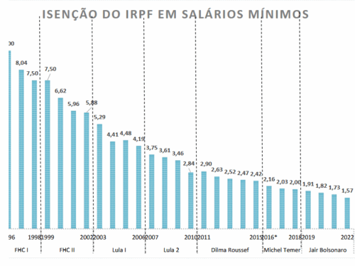 Porém, se compararmos com a famigerada era FHC, como demonstra o gráfico, a taxa de isenção era de 8,04 salários mínimos, hoje são apenas 2 salários, e estamos falando de um governo ferozmente neoliberal. De lá para cá, a defasagem é de 148%.
