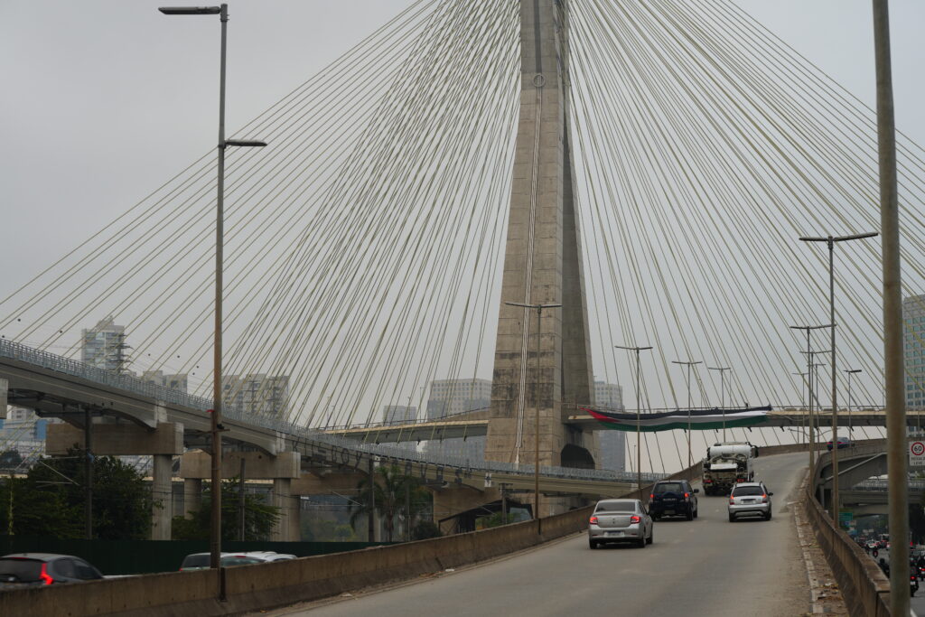 Nesta terça-feira (16), ativistas dos Comitês de Luta estenderam uma bandeira da Palestina de 70 metros na Ponte Estaiada Octavio Frias de Oliveira, no bairro do Brooklin.