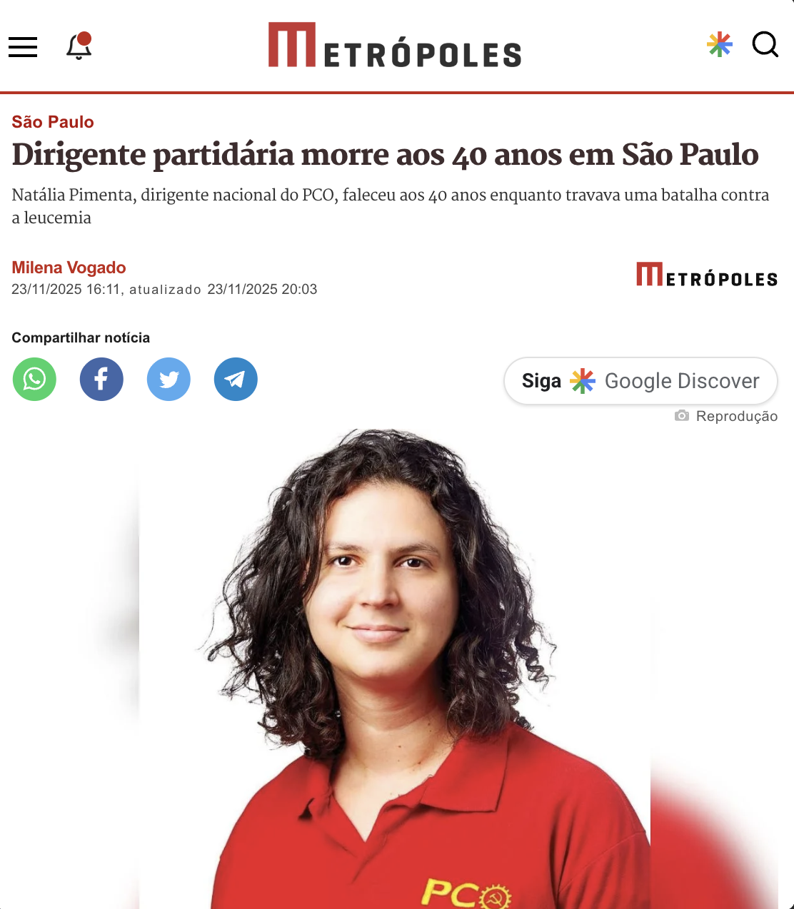 No artigo Dirigente partidária morre aos 40 anos em São Paulo, o Metrópoles, o jornal mais acessado dentre os citados, destaca a trajetória de Natália, relembrando sua dura batalha contra o câncer: