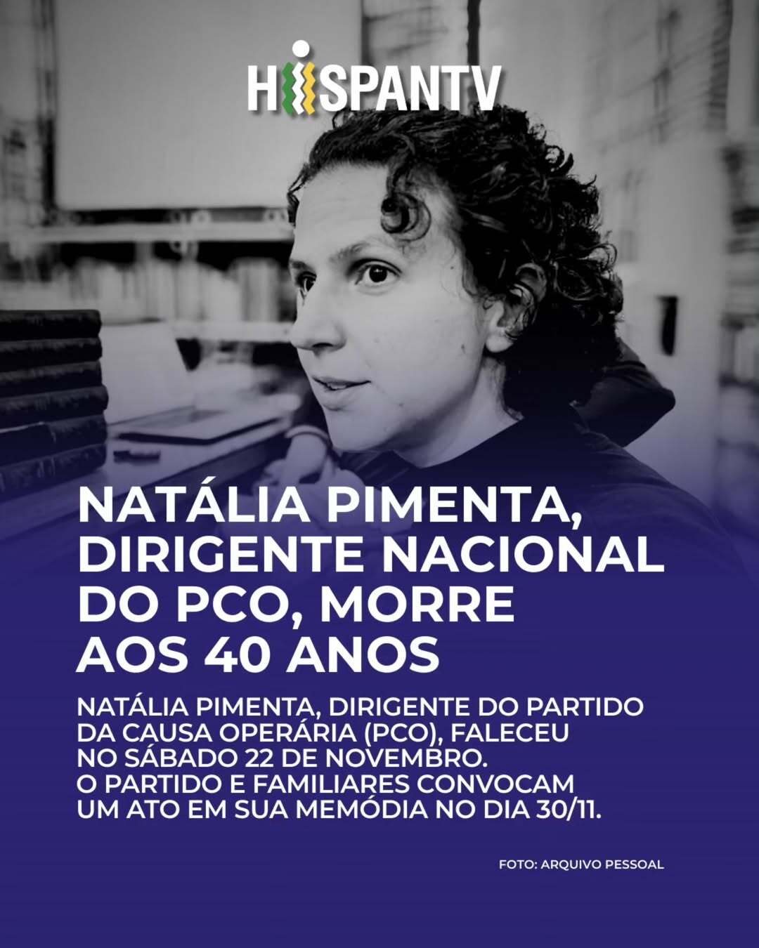 Natália Pimenta, dirigente nacional do Partido da Causa Operária (PCO), faleceu após complicações de um câncer, em meio à uma disputa judicial por acesso a medicamento adequado. Iniciou a militância aos 12 anos e dedicou quase três décadas à construção do partido, sendo responsável por formar a nova geração que hoje compõe sua base. Liderou o movimento estudantil e foi voz internacionalista na defesa da Palestina. Ato de domingo 30 de novembro, realizado pelo partido, celebra sua vida e reafirma seu legado na luta socialista.”
