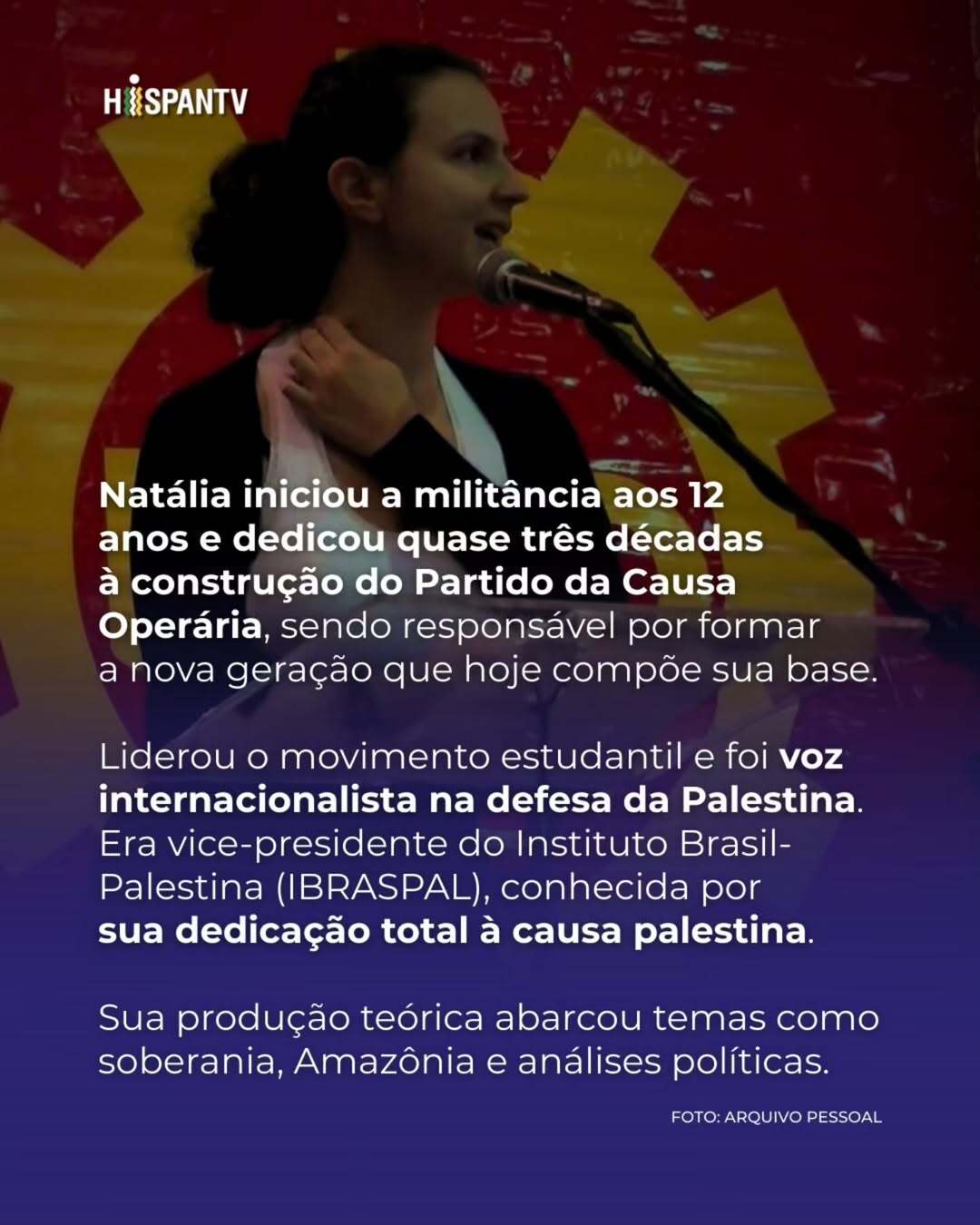 Já a HispanTV Brasil, filial brasileira da emissora iraniana, produziu um “carrossel” (uma sequência de fotos em uma única publicação no Instagram) sobre Natália, destacando sua importância para o desenvolvimento e crescimento do Partido da Causa Operária: