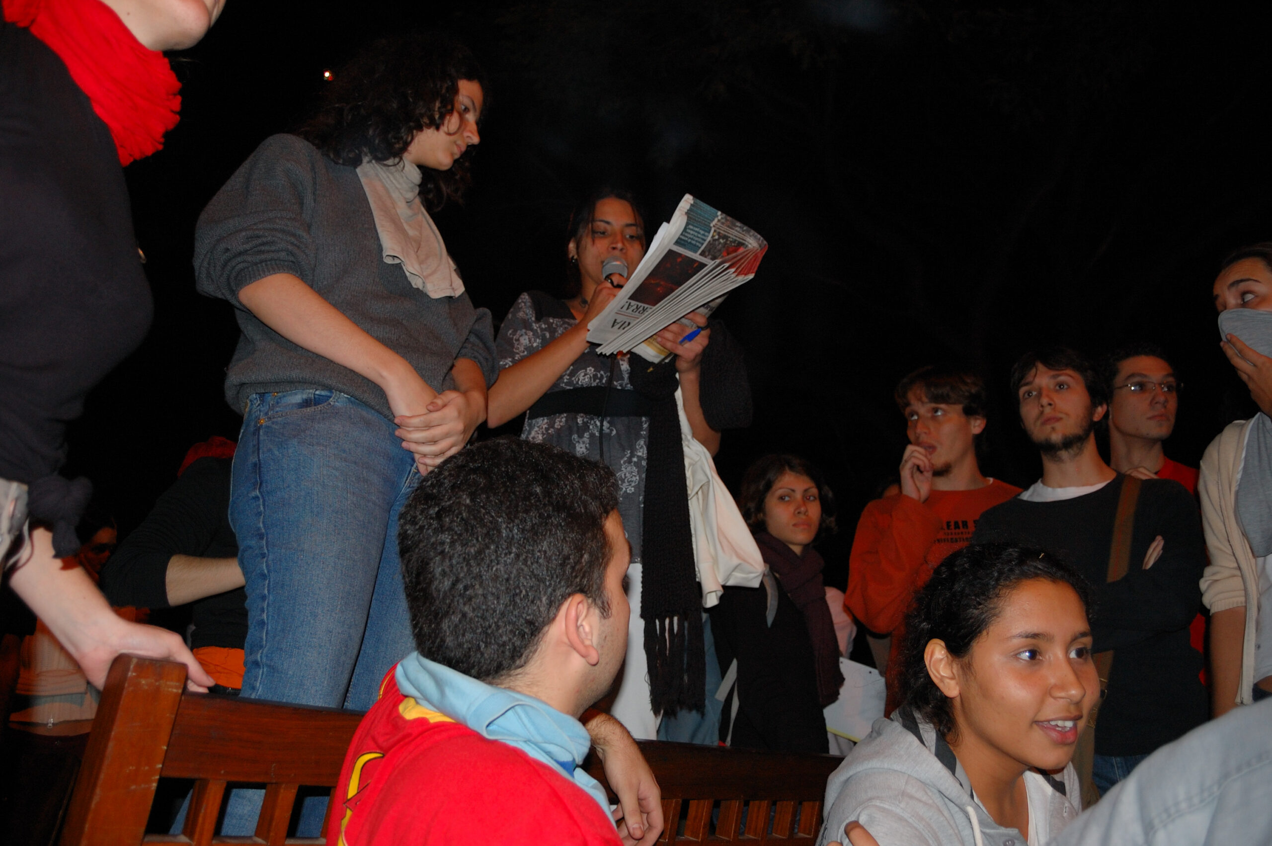Chegamos: “companheiros, vamos descer, vamos à assembleia lá na rua, em frente à PM, para decidir o que fazer! Não podemos recuar diante da polícia”. A esquerda pequeno-burguesa não queria. Ameaçou-se fazer uma pequena reunião entre os que ali estavam para decidir se desciam ou não, se a tal da assembleia seria ali ou na rua.