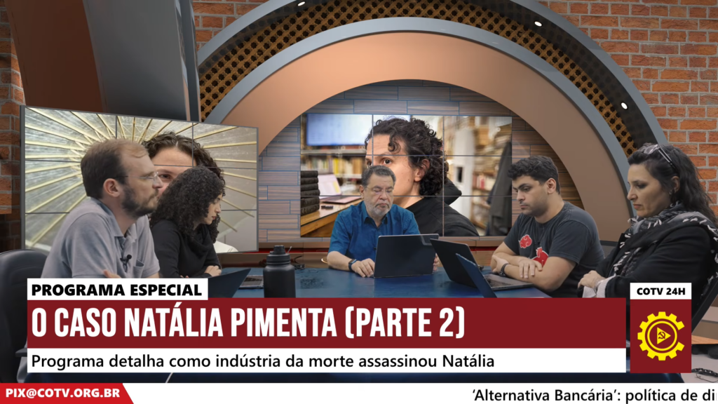 Nesta quarta-feira (17), a Causa Operária TV (COTV) transmitiu, ao vivo, a segunda parte do programa especial sobre o caso de Natália Pimenta, dirigente nacional do Partido da Causa Operária (PCO) falecida em 22 de novembro. A mesa foi composta por Rui Costa Pimenta, presidente nacional do PCO e pai de Natália; Adriana Machado e Izadora Dias, companheiras que acompanharam Natália de perto durante a internação; e João Pimenta, irmão de Natália.