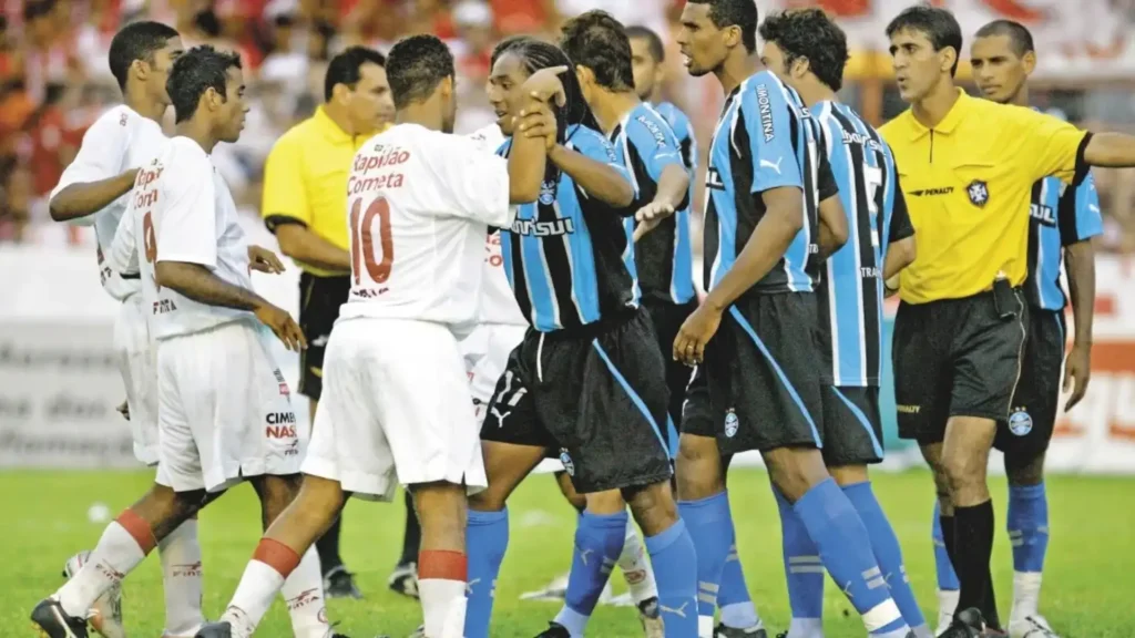 O Grêmio chegou à final do campeonato cambaleante, jogando mal e não convencendo a torcida e a crítica. Para voltar a série A no ano seguinte teria que, ao menos, empatar sua última partida, que ocorreria no estádio do adversário, clube que também subiria para a elite do futebol brasileiro caso vencesse. A partida foi da mais pura emoção; tensa, disputada, ríspida, com futebol de baixíssima qualidade, mas pura adrenalina. No primeiro tempo, pênalti contra o Grêmio, e a bola se choca contra o poste. O empate continuava a favorecer o time gaúcho. Faltando apenas 10 minutos para o fim da partida, o juiz marca outro pênalti, esse inexistente, contra o Grêmio. O caos se estabelece. Três jogadores gremistas são expulsos na confusão e, somados a um que já havia saído, restaram apenas 7 em campo, contra os 11 adversários. Faltavam 10 minutos, 7 jogadores contra 11 e um pênalti contra: nunca houve um momento no futebol tão desfavorável em uma final.