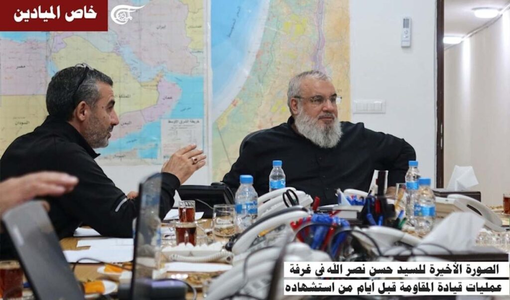 Neste sábado (27), a emissora libanesa Al Mayadeen publicou a última foto mostrando o mártir Saied Hassan Nasseralá, tirada durante uma reunião em uma sala de operações da Resistência, apenas alguns dias antes de seu martírio. Bem ao seu lado estava outra liderança do Hesbolá, o mártir Mohammad Habib Khaireddine, também conhecido como Hajj Hassan, que era o Secretário do Conselho Jihadista.