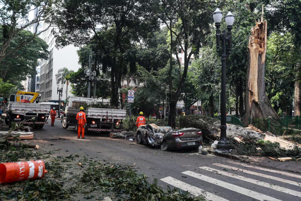 Na quarta-feira, um taxista foi atingido dentro do carro por uma árvore e morreu. Ocorreram 343 chamadas por queda de árvores no dia, incluindo um chichá de cerca de 200 anos no Largo do Arouche. Mais de 156 mil imóveis ficaram sem energia elétrica, fazendo lembrar dos longos apagões de 2023 e 2024. Assim como nas recentes enchentes no Rio Grande do Sul, a culpa é da chuva, do aquecimento global, de Deus ou do Diabo, mas nunca dos governos de direita que se gabam por “enxugar” o Estado.