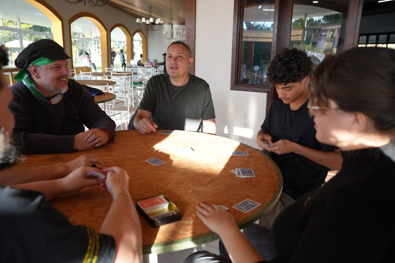 Os jogos de cartas foram os mais populares da tarde. Diversos grupos se reuniram em mesas espalhadas pelo local para partidas animadas que reforçaram o espírito coletivo e integrador do acampamento.
