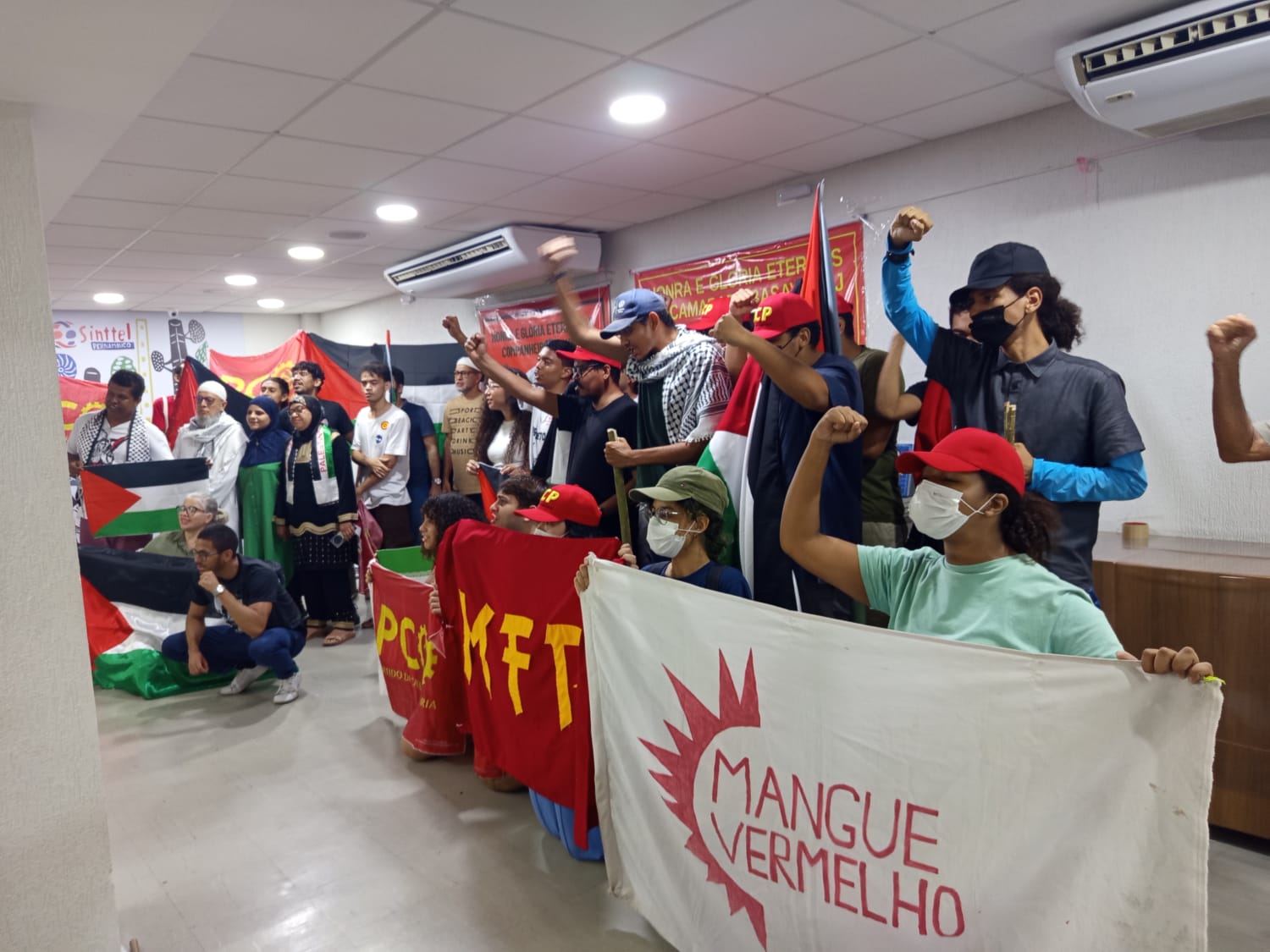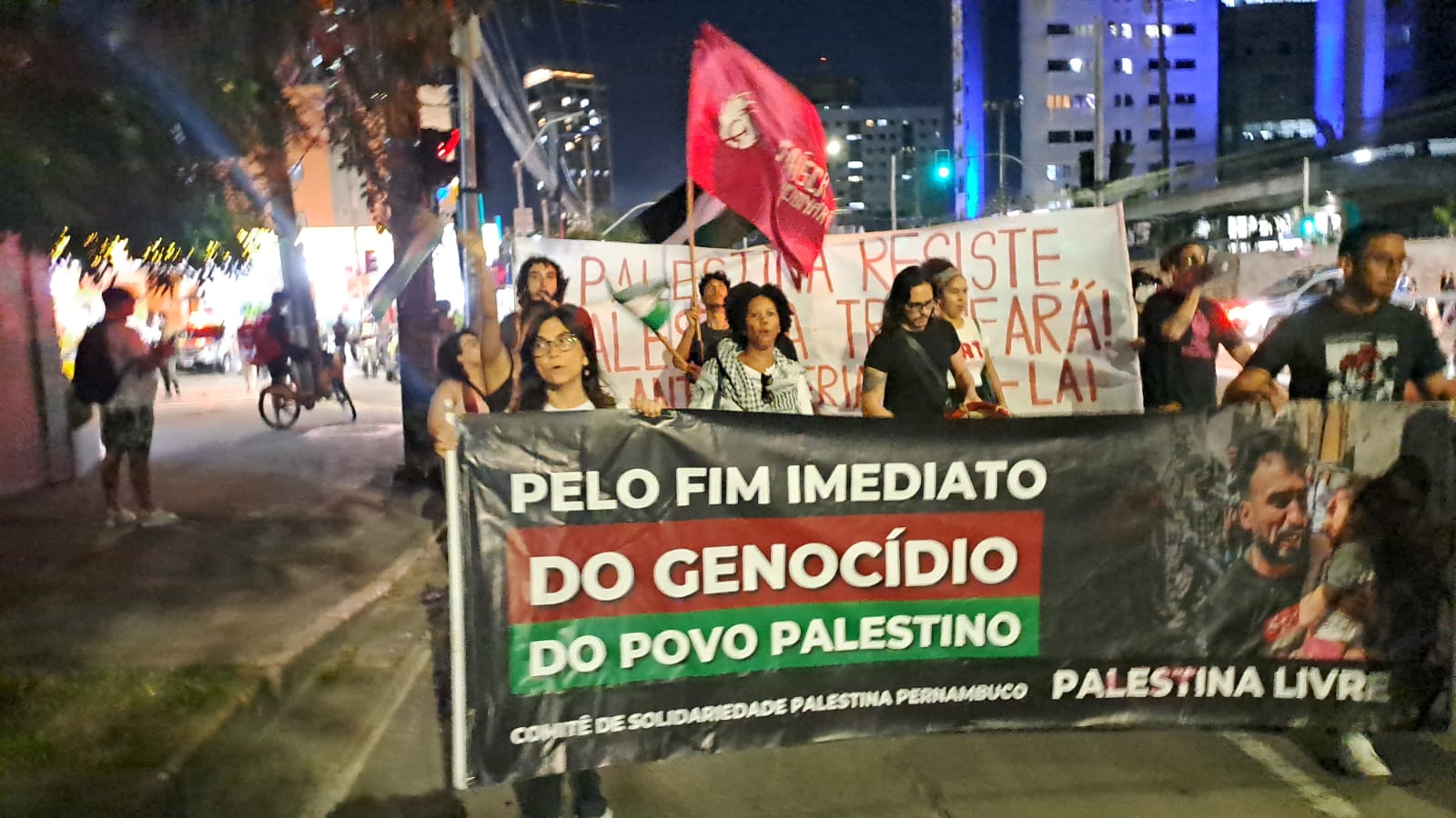 Os manifestantes seguiram em marcha até o Sindicato dos Trabalhadores em Telecomunicações de Pernambuco (SINTTEL), local onde ocorreria uma solenidade em homenagem à resistência palestina.