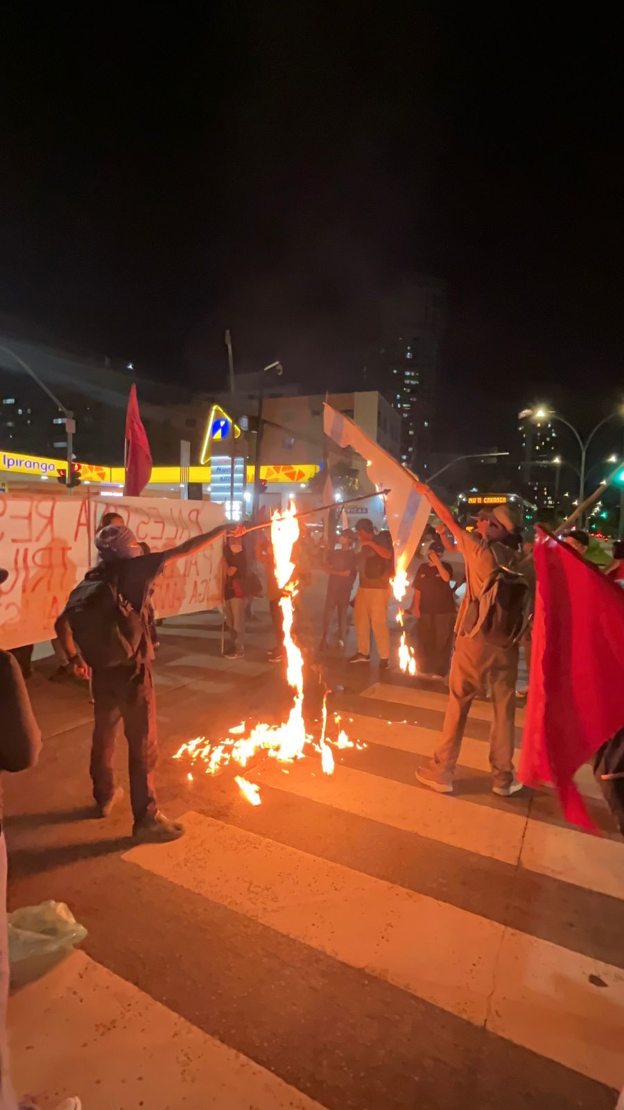 O ato foi impedido de percorrer o seu trajeto original, que previa uma manifestação em frente ao Consulado dos Estados Unidos. Diante da barreira policial localizada no início da rua do Consulado, manifestantes queimaram a bandeira de “Israel”.