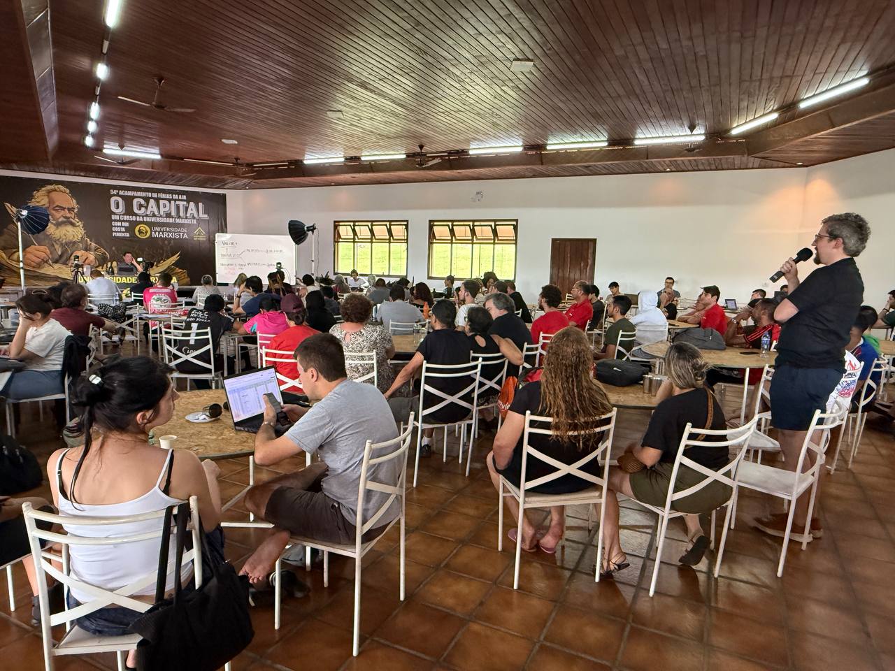 No oitavo dia da 54ª edição da Universidade de Férias da AJR, o acampamento em Sorocaba continuou com intensa programação política e momentos de lazer e integração entre os participantes. O destaque foi a continuação do curso sobre O Capital, a feijoada especial acompanhada de música no almoço, a Análise Política da Semana, a plenária interna, e a animada festa noturna.