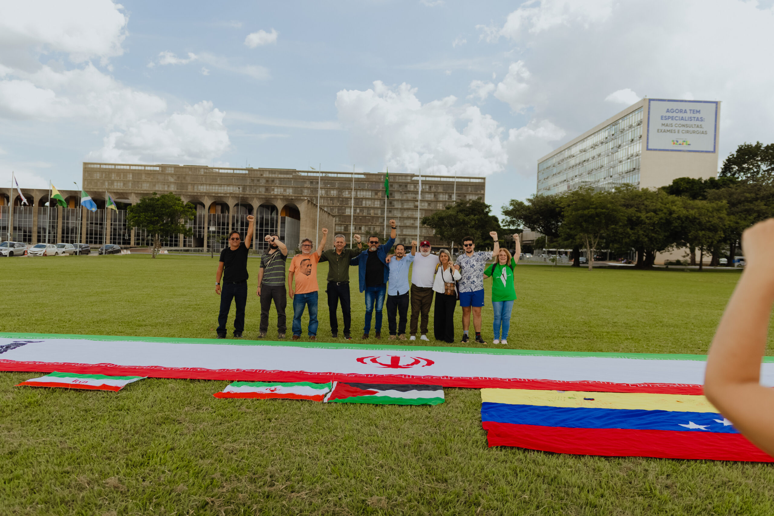 Em uma das extremidades da bandeira, que também foi aberta em frente ao Itamaraty, está escrito “todo apoio ao Irã”. Também foram abertas, ao lado da faixa principal, bandeiras da Venezuela, da Palestina e do PCO.
