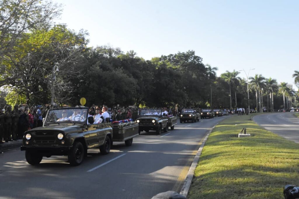 Do aeroporto, os restos mortais seguiram em cortejo pela Avenida Rancho Boyeros, rumo à sede do Ministério das Forças Armadas Revolucionárias. De ambos os lados da avenida, centenas de cubanos concentraram-se desde cedo para prestar suas homenagens. Das calçadas, muitos permaneceram de pé, outros disseram adeus com a mão ou fizeram uma saudação militar.
