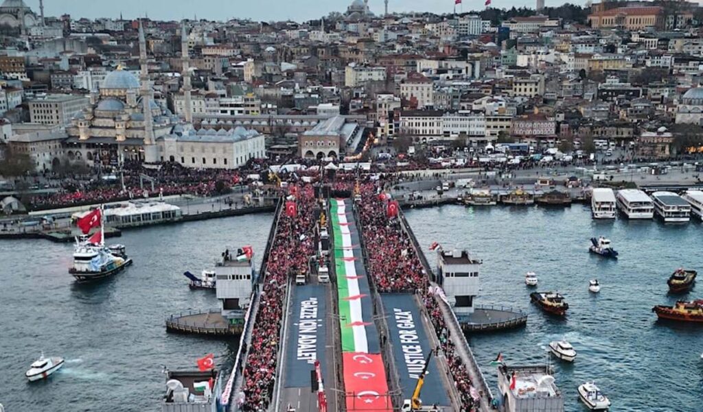 Na quinta-feira (1º), Dia de Ano Novo, aproximadamente 520.000 pessoas participaram, em Istambul, de uma grande manifestação em apoio à Palestina, com concentração na Ponte de Galata. O ato foi organizado sob a Humanity Alliance e a National Will Platform, com a participação de mais de 400 organizações e liderança da Fundação da Juventude Turca (TUGVA).