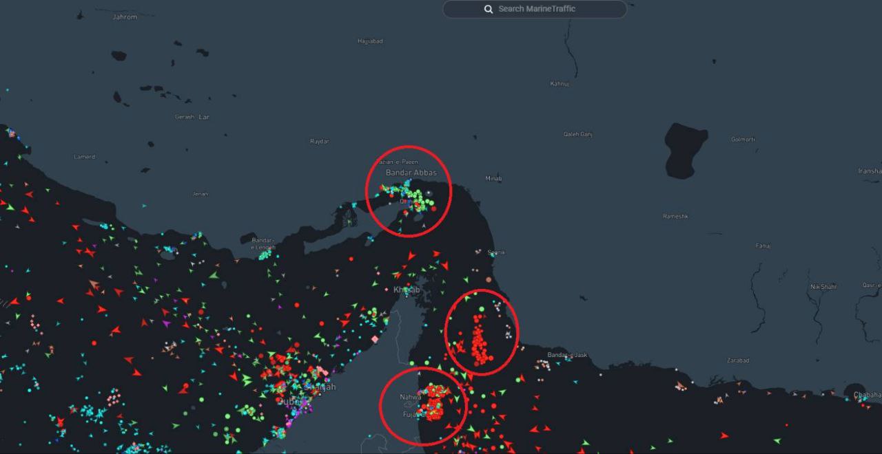 Após os ataques, empresas e operadores suspenderam envios pelo Estreito de Ormuz, e o Irã declarou o corredor como fechado, com alerta para navios na região. Ormuz é rota de cerca de um quinto do consumo global de petróleo, além de parte importante do gás exportado a partir do Golfo. A imagem mostra o congestionamento de embarcações comerciais atrás do estreito de Ormuz:
