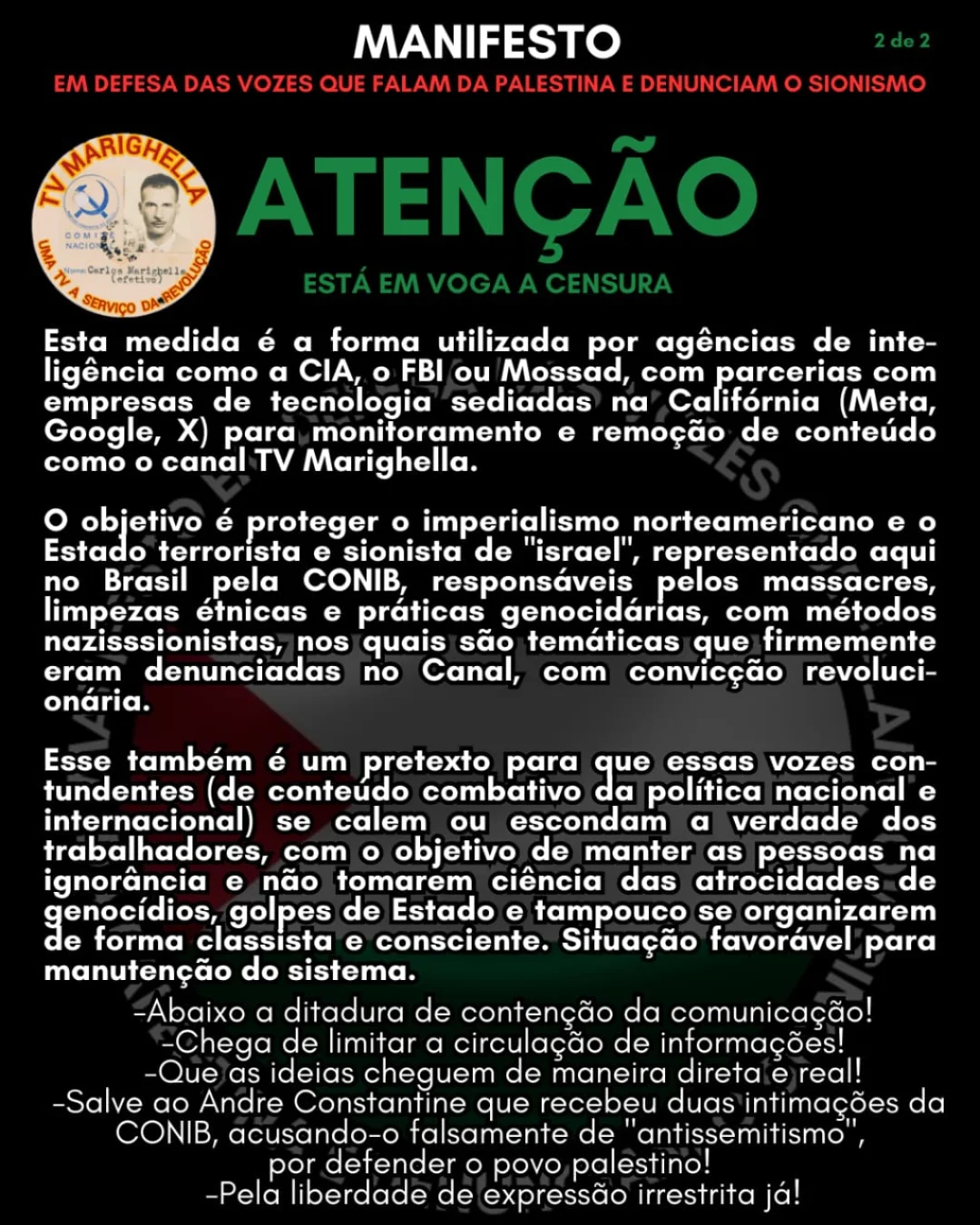 🇵🇸 O Manifesto em defesa das VOZES que falam da Palestina e denunciam o sionismo, sobretudo a voz do companheiro Andre Constantine, vem a público denunciar essa supressão dos direitos de expressar acerca dos crimes de guerra e atrocidades cometidas pelo Estado terrorista e sionista de “israel”, acobertado e financiado pelo imperialismo norte-americano.
