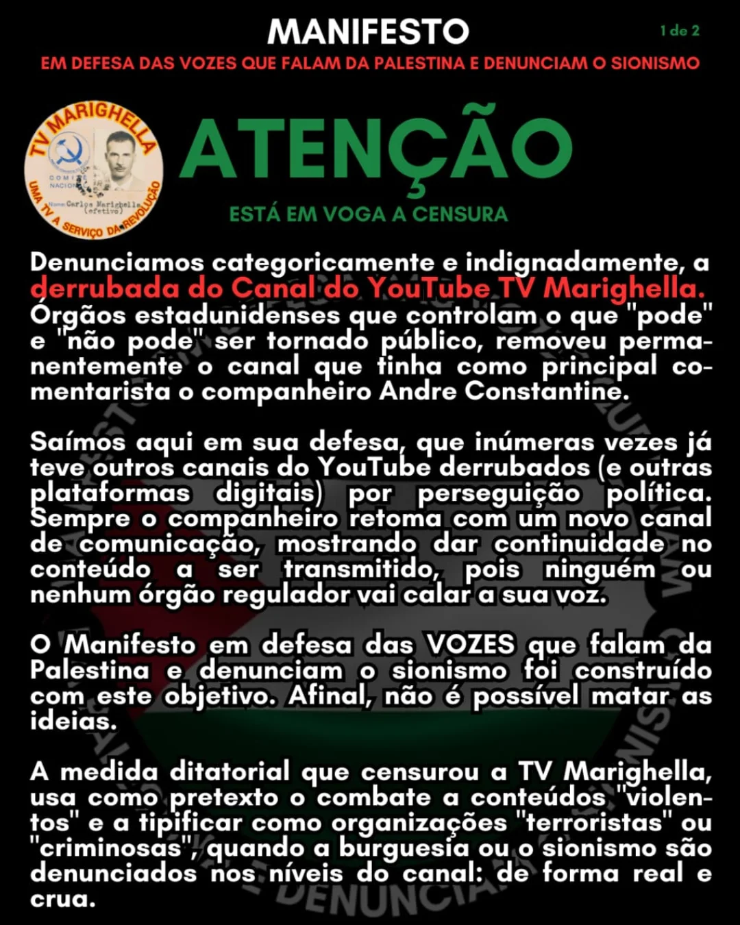 O canal TV Marighella no YouTube foi removido permanentemente pelo Google em um ato escancarado de censura política. No dia 12 de fevereiro de 2026, o coletivo responsável pelo canal divulgou o ocorrido junto com uma declaração contra a censura. O coletivo Manifesto em Defesa das Vozes que Falam da Palestina e Denunciam o Sionismo, destacou como uma rede norte-americana controla o que pode ser dito no Brasil. Participou da denúncia de censura André Constantine, que recebeu intimações da CONIB (Confederação Israelita do Brasil) por acusações falsas de antissemitismo ao defender o povo palestino no ano passado.