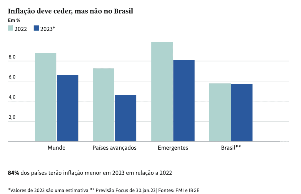 “Enquanto Estados Unidos, zona do euro, Japão e emergentes como Índia projetam desaceleração nos preços em 2023 (ou estabilidade, como China) sem um choque maior de juros, as previsões no Brasil têm piorado sistematicamente.” Como diz a Folha.