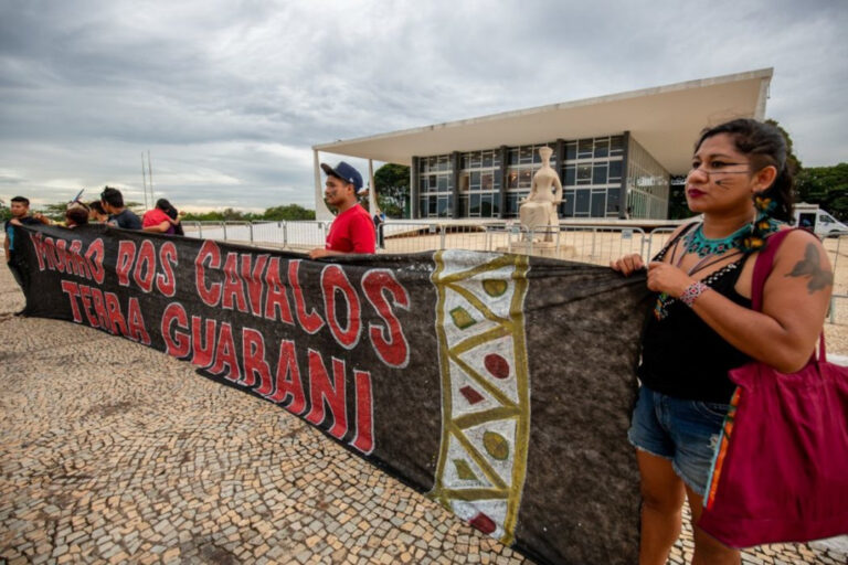 Há uma disputa intensa entre os índios Guarani-Kaiowá, que lutam por seus direitos, e os latifundiários que grilaram as terras dos índios com apoio do estado do Mato Grosso do Sul