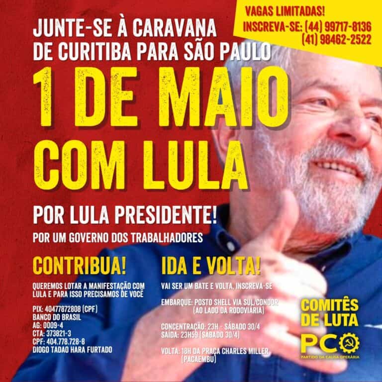 Atenção Curitiba e região! Nesse 1° de maio, dia internacional dos trabalhadores, participe, colabore contribua. Domingo é dia de gritar Lula presidente nas ruas