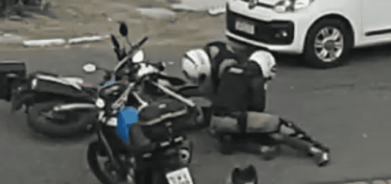 Três policiais batem em um homem já algemado em uma rua de Poços de Caldas. É possível ver que um dos agentes se ajoelha sobre o pescoço da vítima