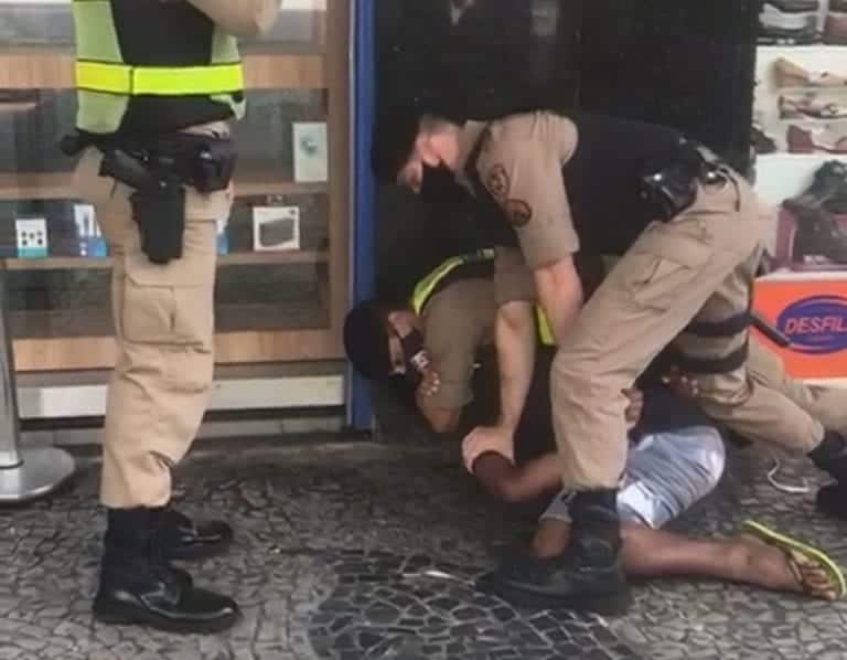 Policiais algemam jovem negro, jogam ao chão e sufocam por suposto roubo de celular.