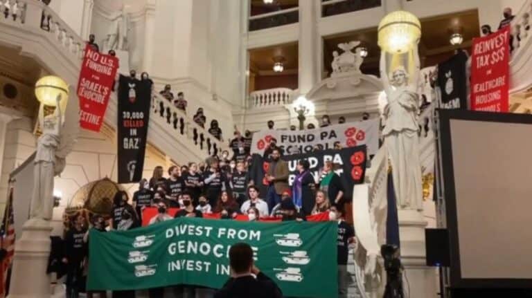 Os manifestantes estavam no capitólio estadual protestando contra o investimento milionário em “Israel” quando foram reprimidos pela polícia norte-americana