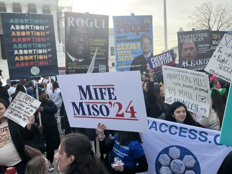 Durante a sessão, manifestantes se reuniram na frente da Suprema Corte e fizeram dois atos: um a favor do aborto, e, outro, contra